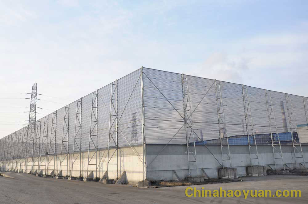 在煤场、渣场地、东厂界(共7处)周围建设防风抑尘网:总长度2600米,高10米,总面积约21000平方米,总投资268万元。该工程于2014年3月开工建设,2015年2月建成投用。防风抑尘网挡风板采用新型三峰防风抑尘网板,其原理是是利用空气动力学原理,按照现场环境加工成一定几何形的挡风板,并根据现场条件将挡风板组合成挡风抑尘墙,使流通的空气(强风) 从外通过墙体时,在墙体内测形成上、下干扰的气流,已达到外侧强风,内侧弱风,外侧小风,内侧无风的效果,从而防止粉尘的飞扬,达到抑尘的效果。新设置的挡风抑尘墙可有效降低来流风的风速,改变一部分来流风通过挡风抑尘墙后的风向,最大限度地损失来流风的动能,避免来流风的明显涡流,减少风的湍流度而达到减少起尘的目的。综合抑尘率>85%,完全满足环保要求。