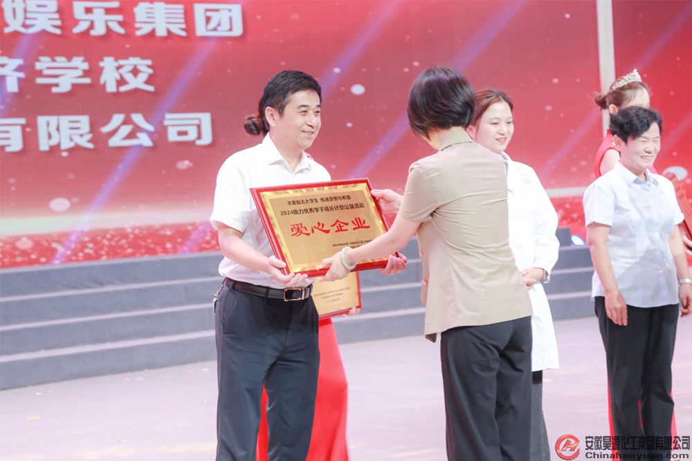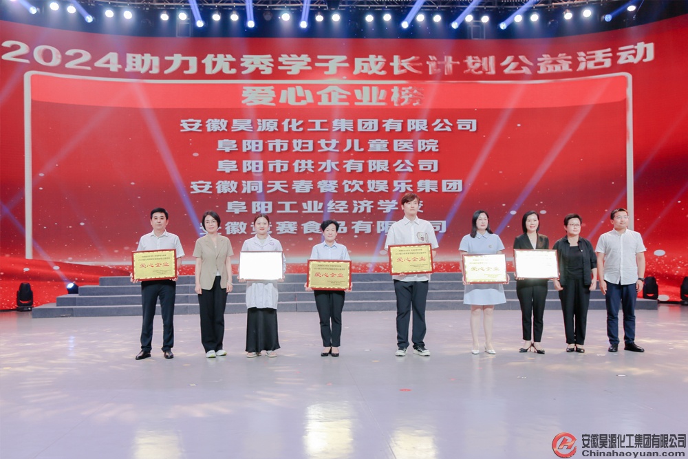 8月13日,由中共阜阳市委宣传部、市关工委、共青团阜阳市委、市妇联、阜阳广播电视台共同主办的“青春逢盛世 奋斗正当时,2024助力优秀学子成长计划公益晚会”在阜阳广播电视台演播大厅举行。工会副主席戚伟代表昊源公司出席晚会,并为优秀学子颁发励志助学金。会上,安徽昊源化工集团有限公司被授予“爱心企业”光荣称号。