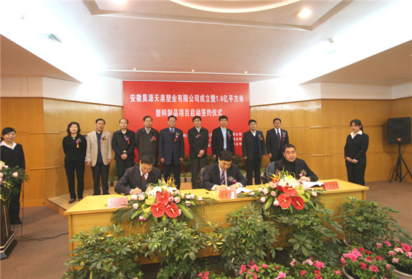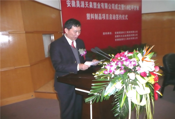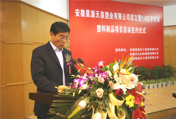 2008年4月22日上午9时18分,在阜阳市政府三楼一号会议室,隆重举行安徽天大企业(集团)有限公司、安徽临泉化工股份有限公司、安徽昊源化工集团有限公司合作成立安徽昊源天泉塑业有限公司签约仪式暨建设1.6亿平方米塑料制品生产线启动仪式。