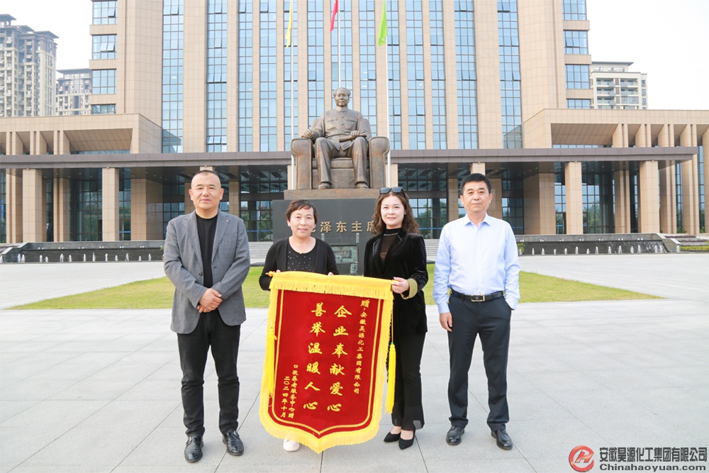 10月14日下午,颍东区口孜养老服务中心院长郭保芳到昊源公司,赠送“企业奉献爱心,善举温暖人心”锦旗。公司副总经理、工会主席张海生,工会副主席戚伟、团委书记朱梅陪同。